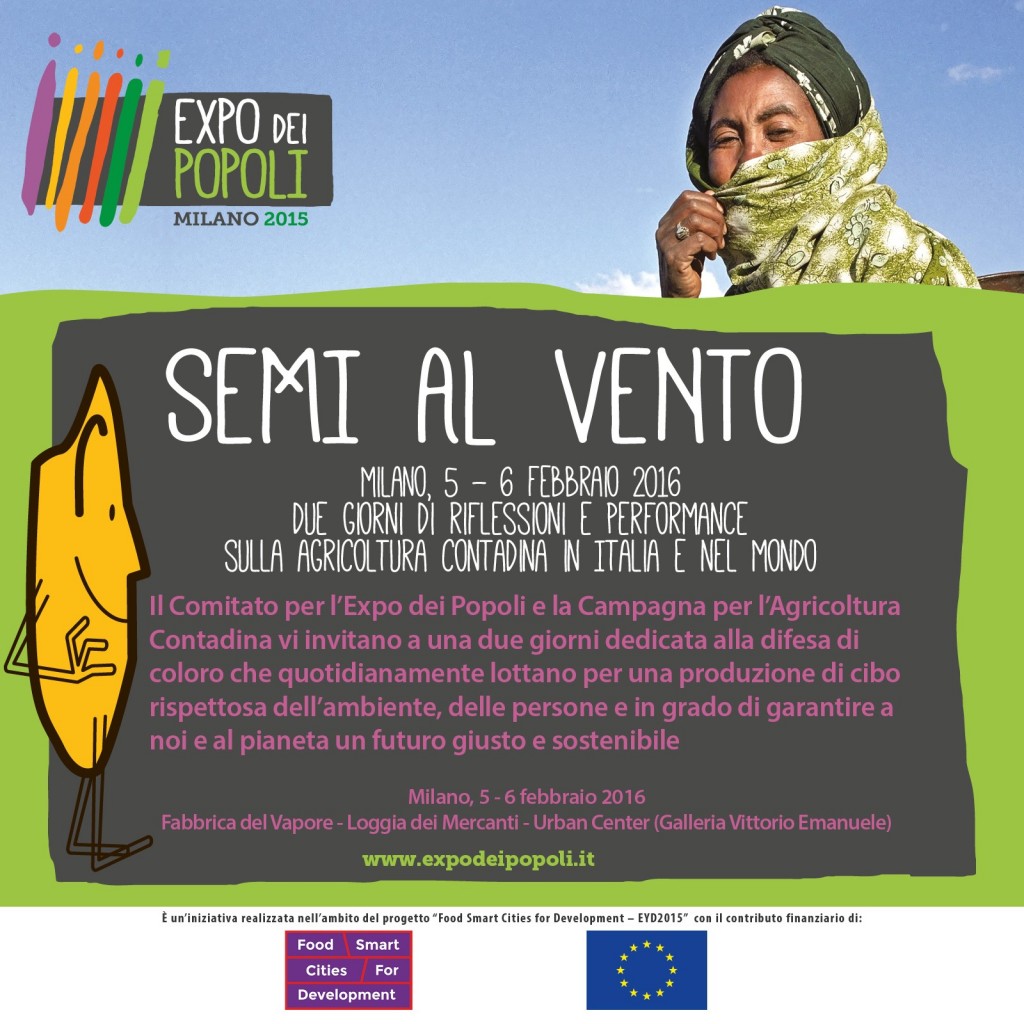 Il 5 e il 6 febbraio 2016 a Milano il Comitato per l’Expo dei Popoli e la Campagna per l’Agricoltura Contadina vi invitano a una due giorni dedicata alla difesa di coloro che quotidianamente lottano per una produzione di cibo rispettosa dell’ambiente e delle persone e in grado di garantire a noi e al pianeta un futuro giusto e sostenibile.